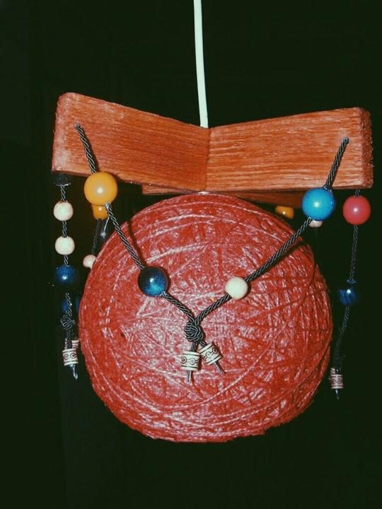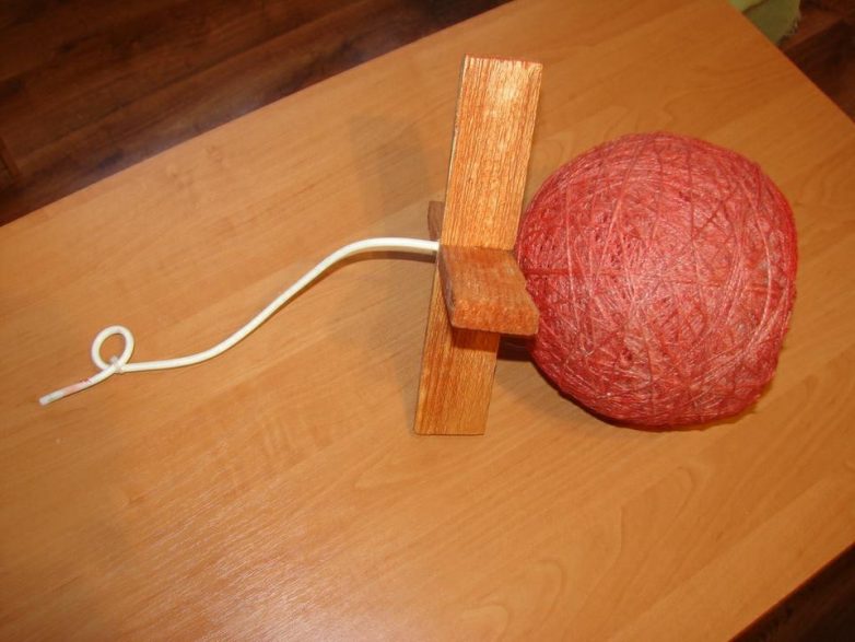 Теперь откладываем патрон и беремся за наш мячик с нитками. Вставляем в клапан иголку от ручного насоса и сдуваем мячик. Осторожно извлекаем его из получившегося абажура. Покрываем абажур лаком для большей крепости и оставляем высыхать. Если вам нужно сделать несколько абажуров одного размера, то опять надуваем мячик до прежних размеров. Размер установить легко. Маркер на нитке и гвоздик хранят нужный радиус метки. Просто сопоставьте их. Теперь обмойте мячик теплой водой, хорошо протрите и повторите процедуру с клеем и обмоткой, сдуванием и надуванием столько раз, сколько нужно.