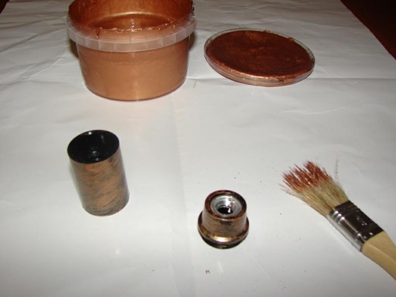 Оставляем клей засыхать, а пока займемся подготовкой патрона. Лучше всего подойдет для этих целей черный патрон из карболита. Наша задача лишь немного его доработать. Можно использовать патрон с большим цоколем под экономичную лампочку или с маленьким. Легкими мазками наносим античную медь. Так как патрон уже черный, то мазки краски создадут вид благородной медной патины. Подсоединяем к патрону провода. Для этого раскручиваем его заднюю часть, просовываем в колпачок провод и подсоединяем провода к клеммам. Желательно найти провода в тканевой оплетке.