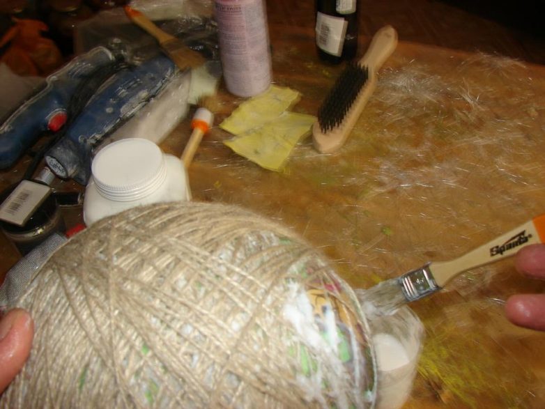 На клей наматываем льняную веревку до метки. Наматываем много, но стараемся оставлять зазоры, чтобы абажур был просвечиваемый.