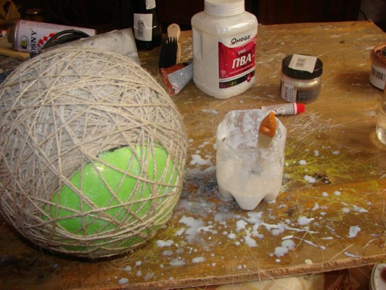 Теперь сделаем абажур для лампочки. Мажем детский мячик любым разделителем, будь то подсолнечное масло, крем или вазелин. Даем разделителю схватится, и наносим кисточкой жидко разведенный клей ПВА.