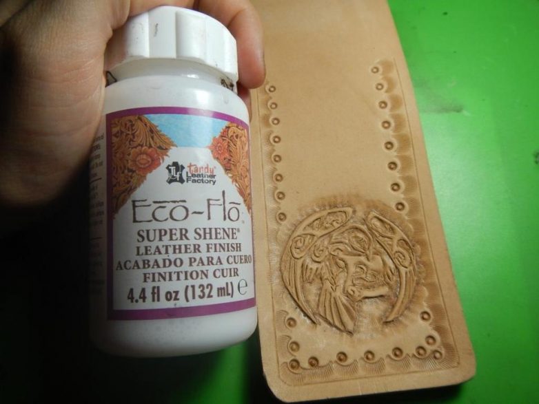 Когда покрашенная кожа высохнет полностью, наносим финишное покрытие. Тоже в 2-3 слоя, каждый раз давая предыдущему слою просохнуть.