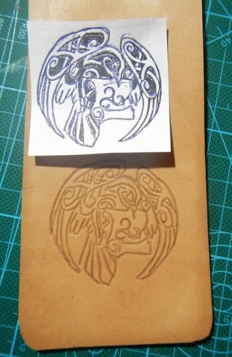 Теперь нужно перенести рисунок на кожу. Накладываем распечатку и обводим рисунок, хорошо надавливая на линии. При этом важно не переусердствовать и не порвать бумагу, чтобы на коже не оставалось лишних следов.