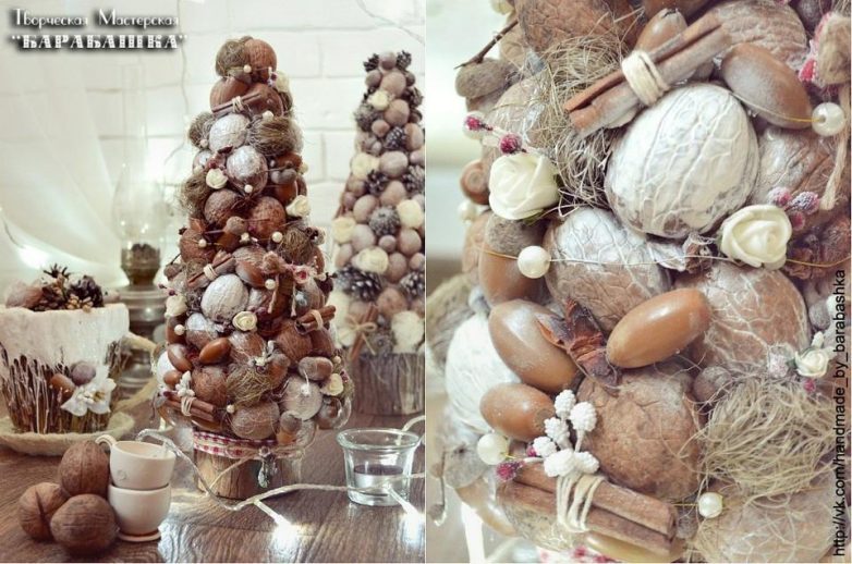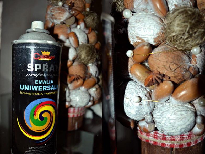 Теперь берем белую краску в баллончике, выходим на свежий воздух и закрашиваем некоторые орешки в белый цвет.