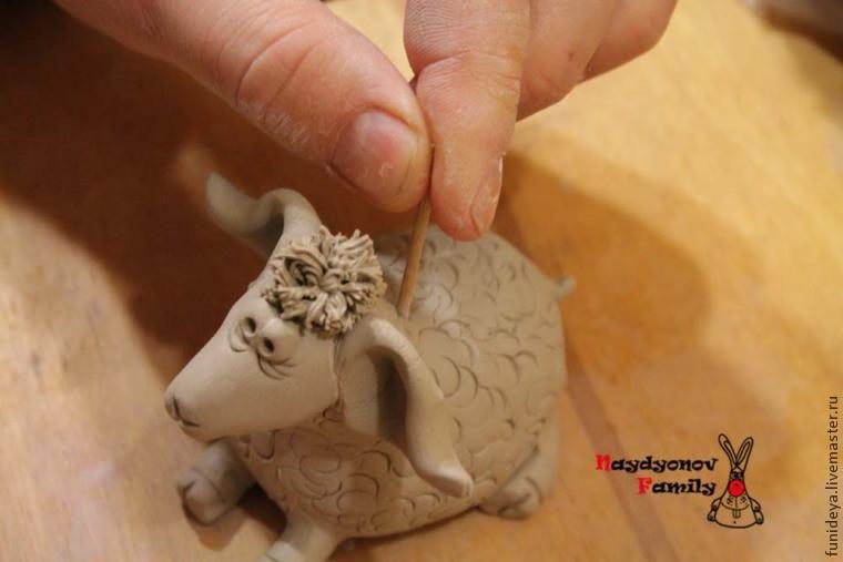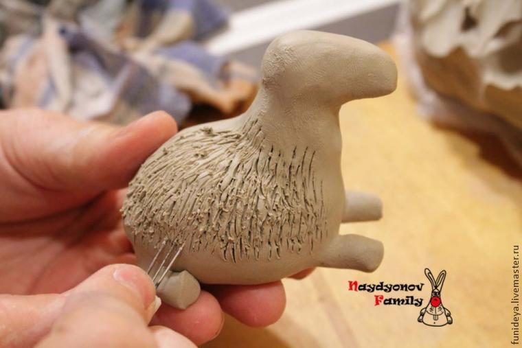При помощи сита делаем овечке прическу. Продавливаем через сито небольшой кусок глины, потом иголкой крепим челку овечке.