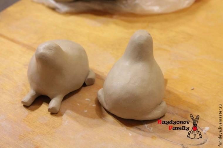 Теперь можно приступить к голове. Берем два небольших кусочка глины и раскатываем в форму капельки
