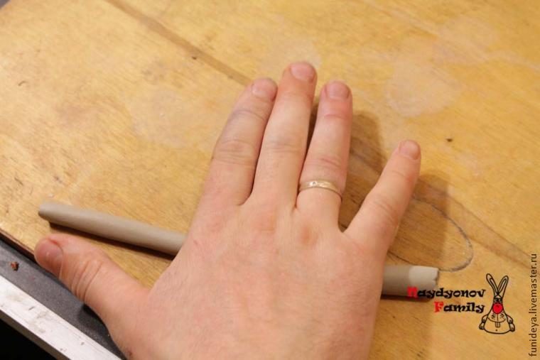 Теперь делаем ноги, для этого раскатываем небольшой кусок глины в жгутик