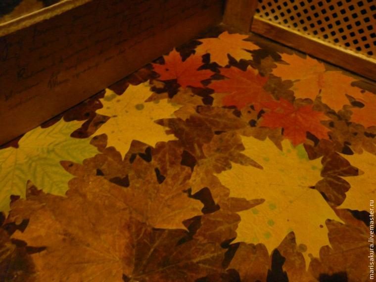Берём кленовый лист и кладём его на лак. Он приклеивается на лак. До этого пробовала на клей для дерева, не получилось то, что нужно. Раскладываем на лак остальные листья, приглаживаем их кистью и сверху тоже покрываем лаком, я не жалела лак, покрывала очень тщательно, чтобы заполнить им листья полностью:
