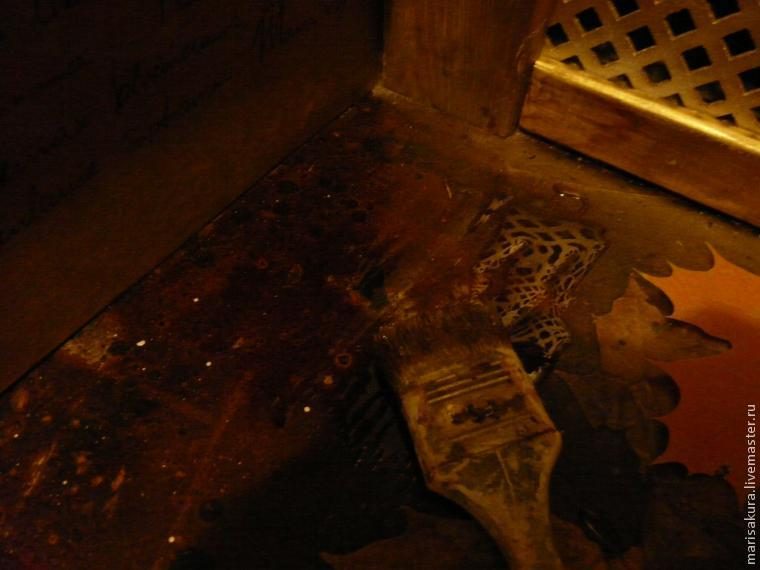 Когда закончите, книги закрываете, складываете стопочкой и… можно приступить к подготовке основания (пола). У меня — крашенное ДВП. Краска на нём старая, местами отлетела. Я решила это использовать. Взяла морилку под дуб, не водяную, и покрыла ей пол. Покрывала свободно, скорее, рисовала :) Где-то оставляля подтёки, где-то делала более прозрачно. Эта морилка сохнет быстро, полчаса. Вы можете поэксперентировать с фоном (например на куске ДВП), используя любой цвет краски, морилки и т.д. Краски на водной основе вполне подойдут для этой цели.