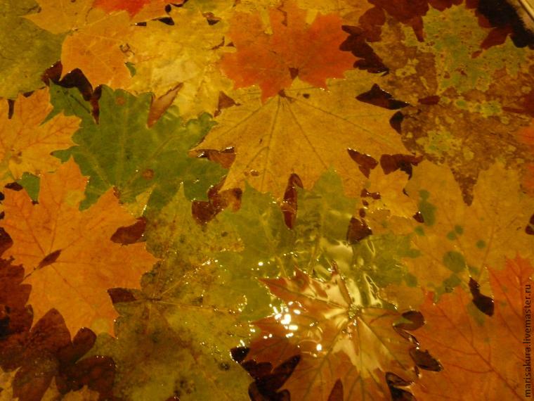 Яхтный лак удивительный… очень прочный, влагостойкий. Продаётся в любом строительном магазине. Я брала глянцевый. Он даёт интересный эффект. Словно только что прошёл дождь, и листья плавают в воде. На фотографии он ещё не высох, но когда высохнет, сохранит такую же прозрачность. Ещё фото: