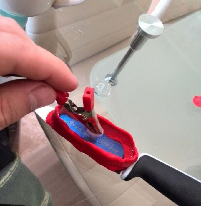 Заливаем раствором соленой воды (на 200 гр. я сыпал ложку чайную). Берем ненужный блок питания (я брал 12v 1.5A, больше точно не нужно), на нож кидаем +, минусовой клеммой водим по воде. Главное долго не держать (–) в воде. Секунд 5-7 поводили, достали клемму. 3-4 раза повторили, заменили раствор соленой воды, заодно посмотрели, что получается.