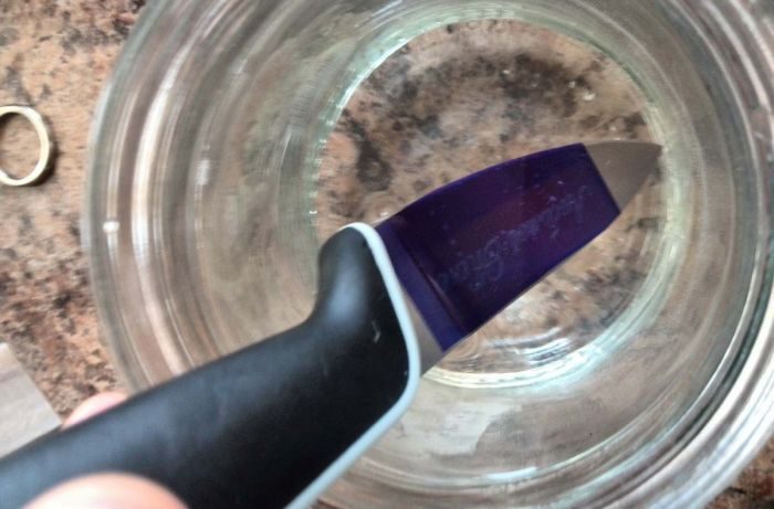 Покуда нож засвечивается, готовим раствор кальцинированной соды. Купить можно в хозяйственном, это обычная сода для стирки. На пол-литровую банку я сыпал чайную ложку с горочкой. Всю эту бадягу перемешиваем до полного растворения.
