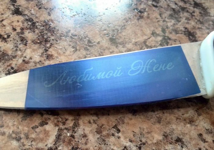 Берем пленку для печати на лазерном принтере (в моем городе не нашел где купить, пришлось через интернет-магазин заказывать) и печатаем что вашей душе угодно, главное не сильно тонкими линиями. Я долго голову ломал, что можно на кухонном ноже написать, и решил жене сделать сюрприз. Придет с работы, возьмет нож хлебушка отрезать и обрадуется(надеюсь)! Принтер у меня древний, поэтому тонер немного запачкал пленку, но в принципе ничего страшного.