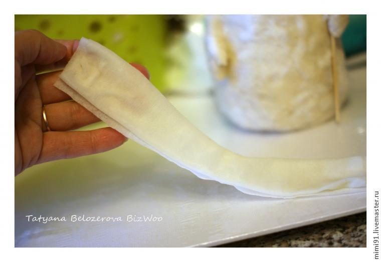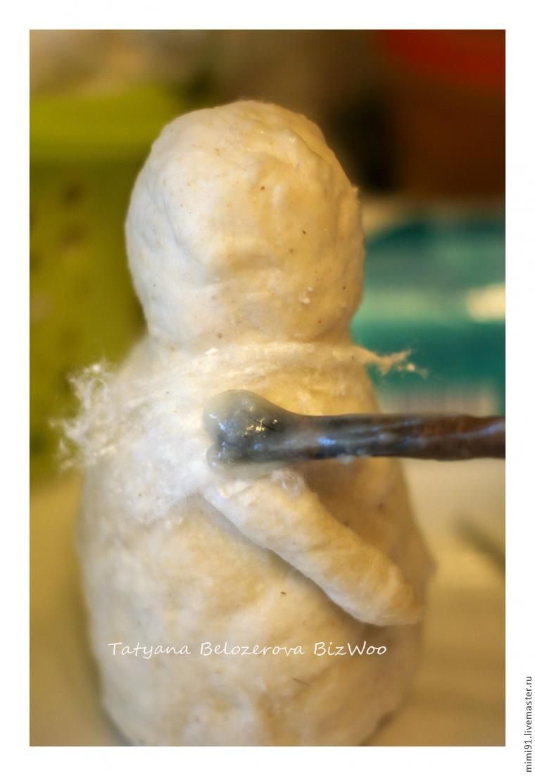 После того, как всю тушку вы облепили ватными кусочками, делаем руки. Я делаю их с помощью вязальной спицы. Отрываю полоску ваты, промазываю с двух сторон клеем и скручиваю в трубочку. С одной стороны край оставляю распушенным, чтобы удобнее было приклеивать к телу.