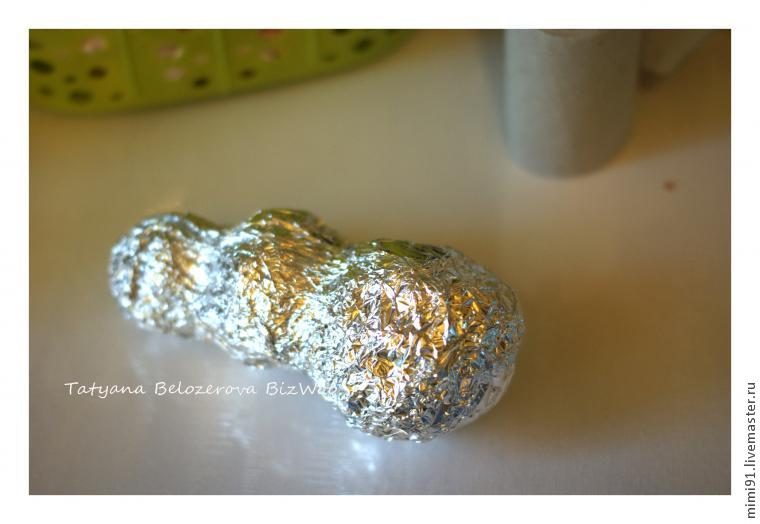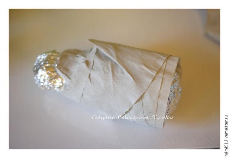 Далее я добавила объем в «талии» с помощью туалетной бумаги и снова обернула фольгой (вы можете сразу набрать нужный объем изначально с помощью газет).