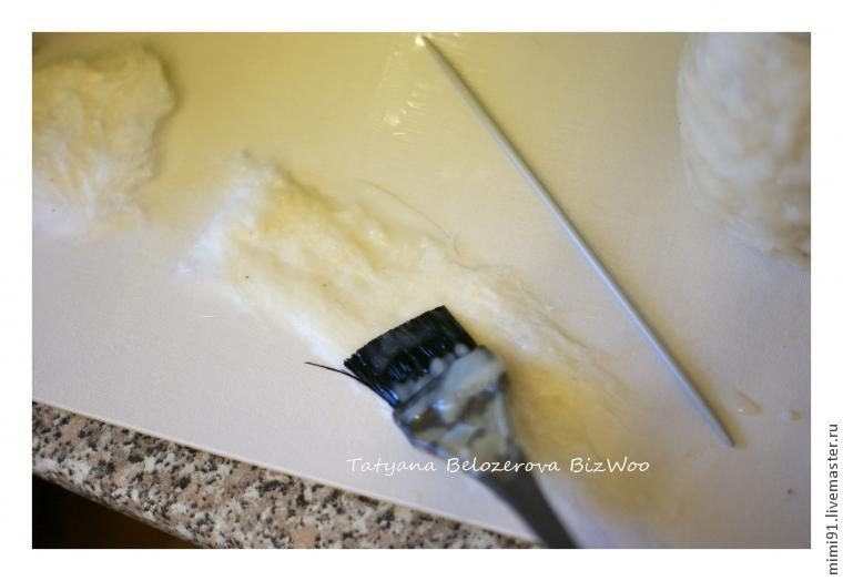 Теперь берем клей (его должно быть на кисточке много, кисть лучше взять из щетины плоскую и широкую) отрываем тонкие кусочки ваты, прикладываем на заготовку и кистью с клеем примазываем к тушке. Я пользовалась мучным клейстером.