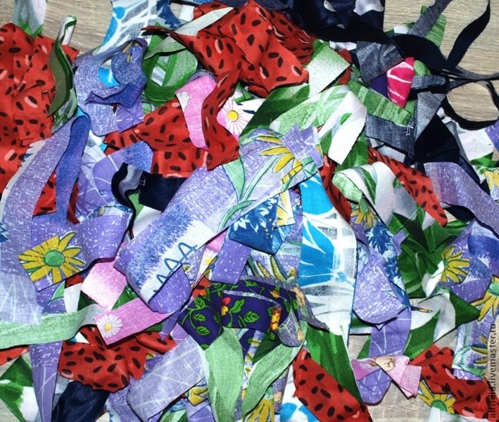 Нарежем из остатков и обрезков ткани полоски шириной по 2-4 см. Длина может быть любой. Чем короче будут полоски, тем пестрее будет ваш коврик.