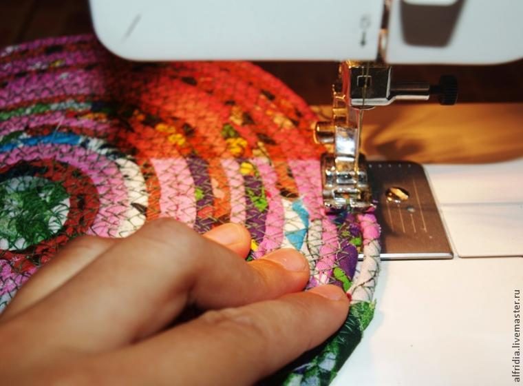 Во время шитья аккуратно придерживаем веревочку и прижимаем ее к основанию, при этом не натягивая, иначе коврик будет заворачиваться по краям.