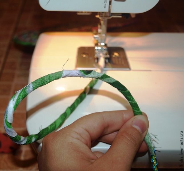 Затем берем следующую полоску ткани и все повторяем. В итоге должна получиться длинная веревка, обшитая тканью.