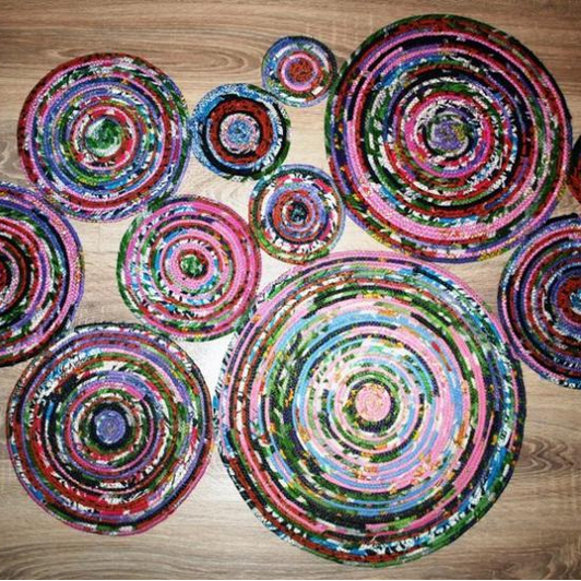 Поэтому после того, как кружок необходимого размера готов, отрезаем веревку, наматываем ткань до конца веревки, отрезаем и прошиваем на машинке, фиксируя край.