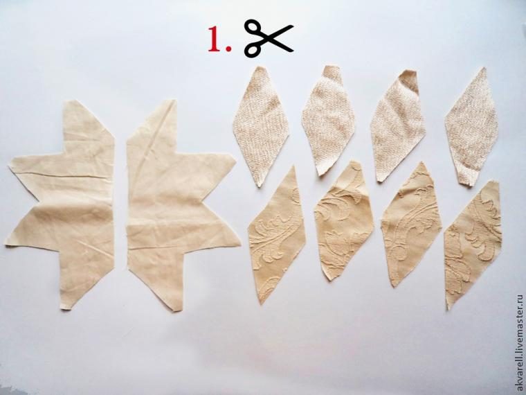 1. Выкраиваем. Обратную сторону звезды обязательно кроим из двух половинок — через них будем выворачивать звезду!