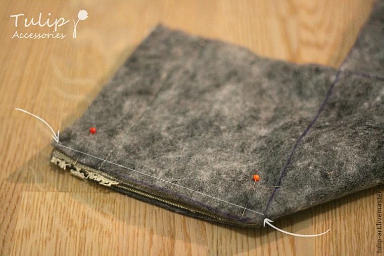Вкладываем подкладку в наружную сторону, скалываем булавками.