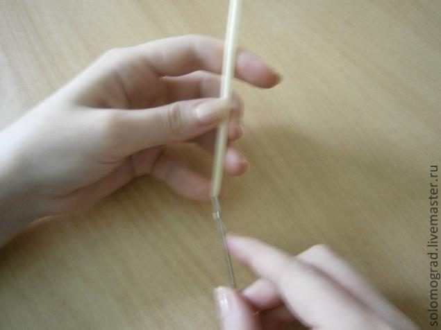 Проплетаем соломинку до конца и приходит время надставления. Обрезаем лишний кончик соломинки