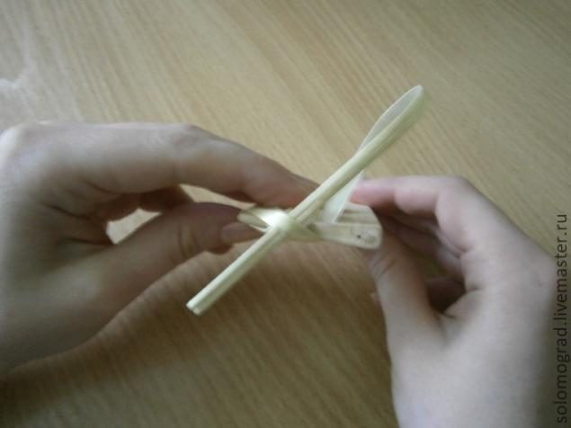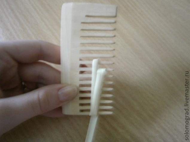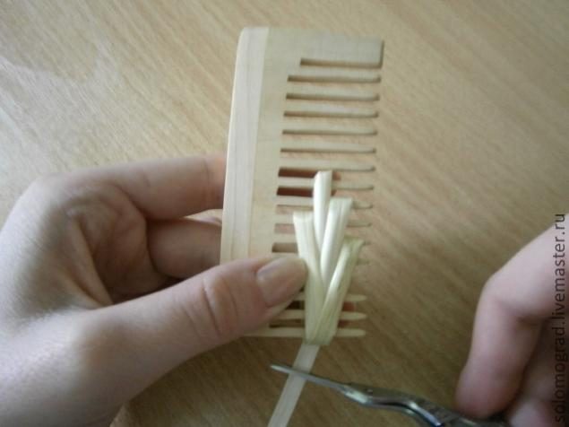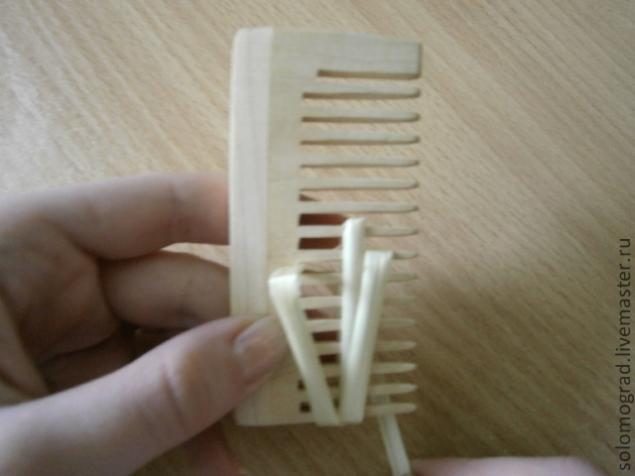 Приступаем к плетению. Соломенную ленту внутренней стороной вверх с изнаночной стороны расчески продеваем между 2-м и 3-м зубцами расчески