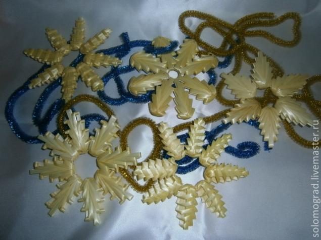 Такой листик должен хорошо просохнуть на расческе, а затем его можно снять. Снежинка состоит из 6 или 8 листиков. Нанизываем их на нитку, обильно промазанную клеем, и связываем ее. Лишнее обрезать.