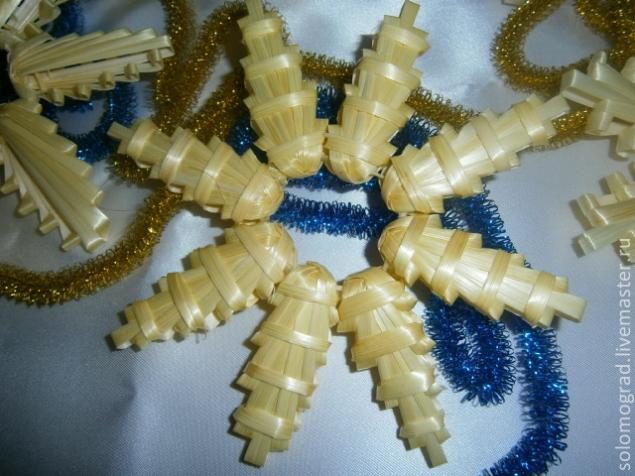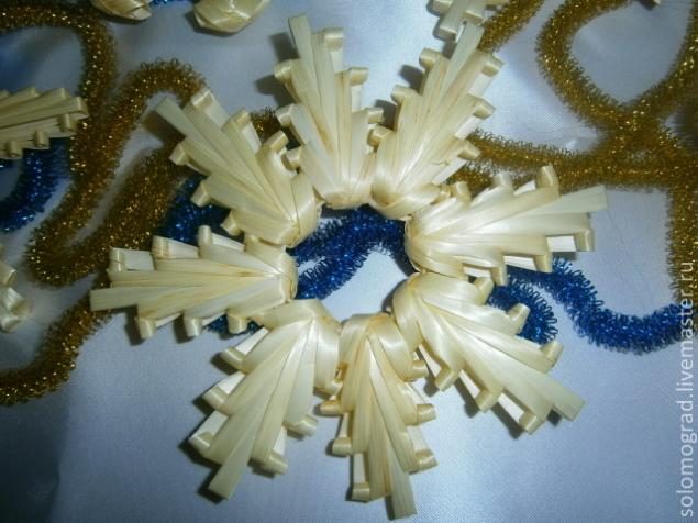 отсчитываем снизу несколько зубцов (у меня 9, от этого зависит диаметр снежинки) и продеваем между 9 и 10 зубчиками соломенную ленточку, потом ее опускаем вниз точно на серединочку на ленточку первого витка.