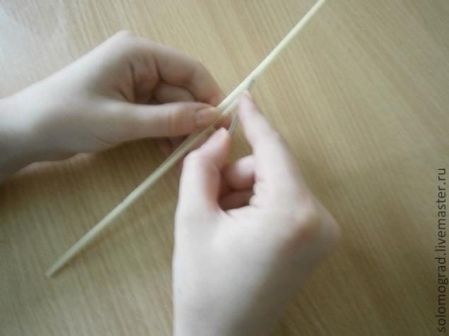 Работу начинаем с расщипления соломки на две равные части — далее соломенные ленты. Для этого берем и ушком иголки поддеваем снизу соломинку и расщепляем ее с одной стороны, а затем сожмав соломину пополам прокалываем острым кончиком иголки на линии сгиба и расщепляем соломинку по всей длине. Получается две соломенные ленты.