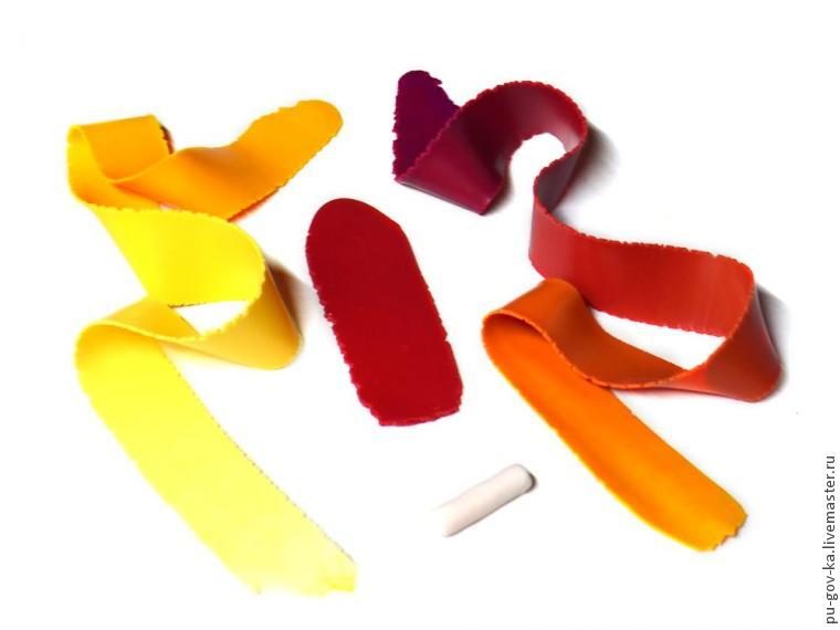 5. Разминаем все цвета полимерной глины. Смешиваем нужные оттенки. В данном случае использовались теплые цвета: желтый, желто-оранжевый, розовый темный. Холодные: голубой, бирюзовый, темно-синий, темно-зеленый. Плюс белый и темно-коричневый (вместо черного).