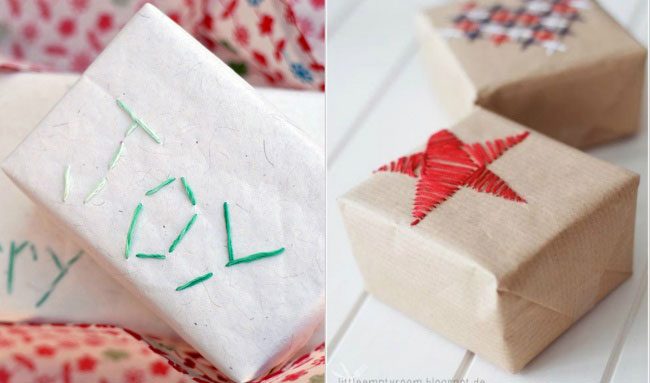 Если вы хотите сделать что-то очень необычное, можете попробовать вышить прямо на бумаге украшение или пожелание. Бумага — податливый материал, и это будет несложно. Другой вариант — использовать краску, на которой можно писать мелом, как на школьной доске. А если у вас есть швейная машина, вы легко сможете сделать что-то подобное: