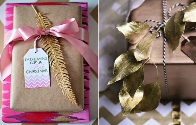 Если у вас есть баллончик краски — превратить в украшение можно что угодно. Главное — вовремя остановиться. Для упаковки подарка отлично подойдут золотые веточки, шишки, листья и другие «природные» мелочи.