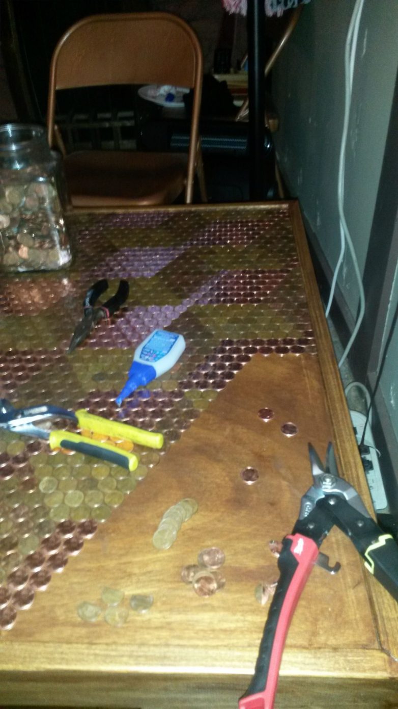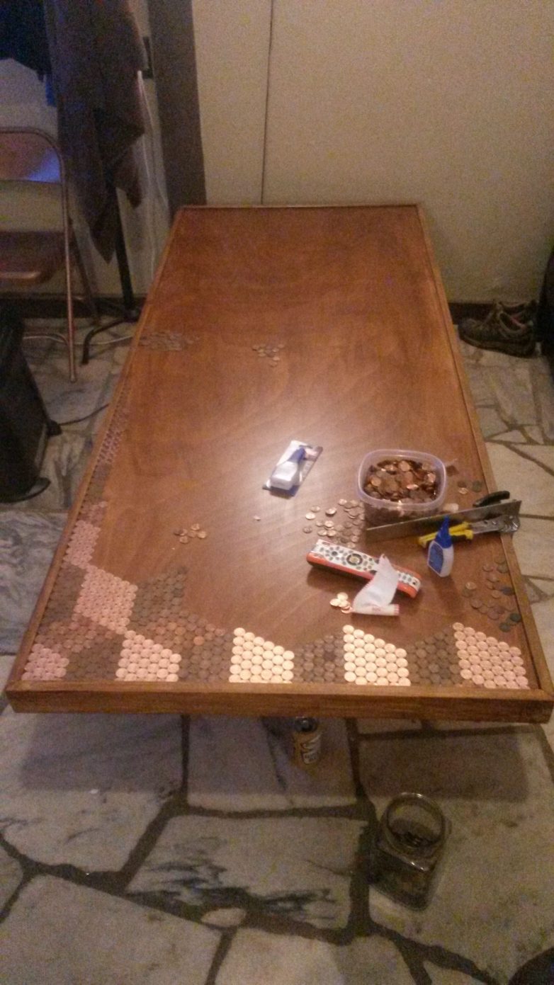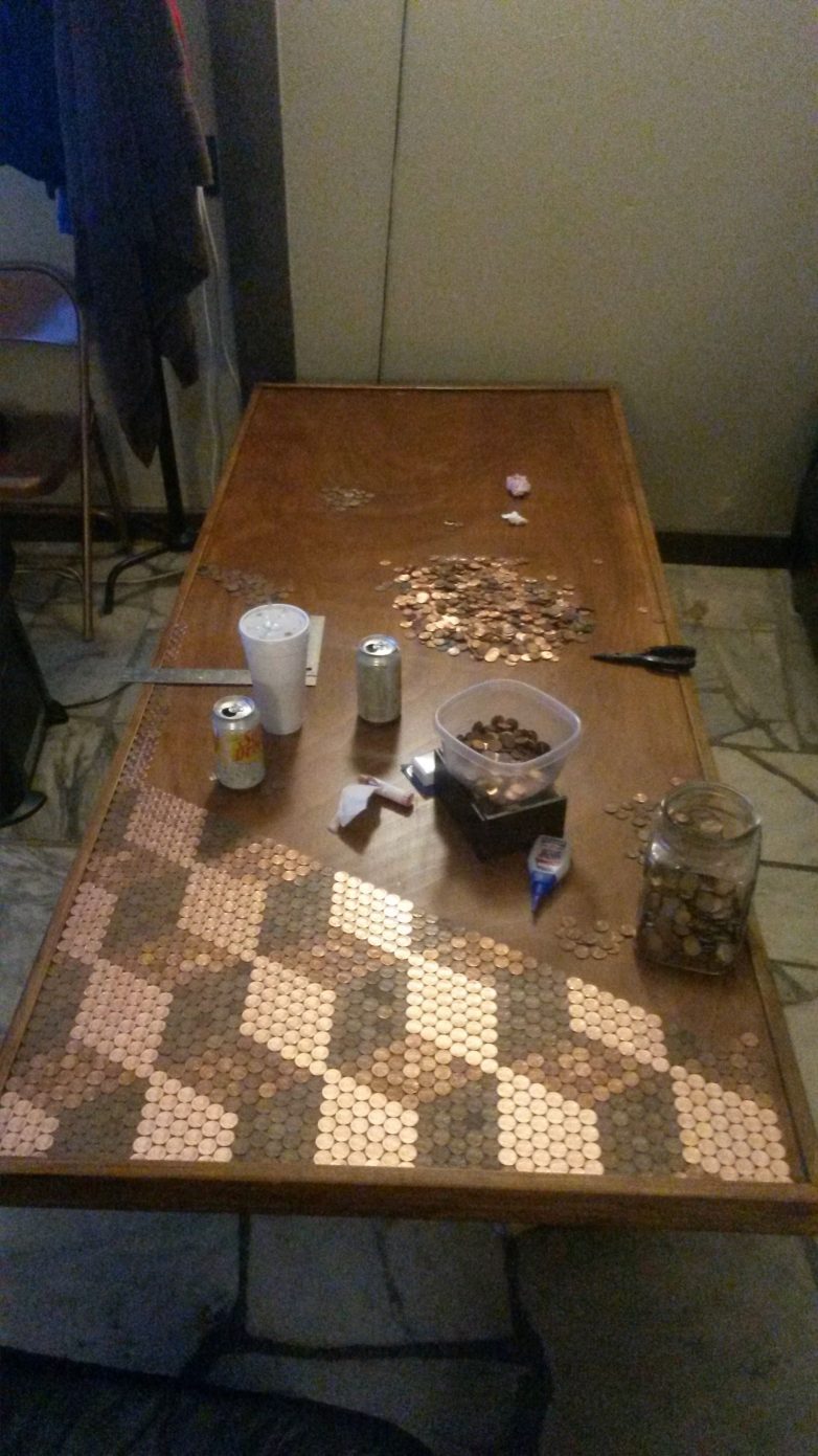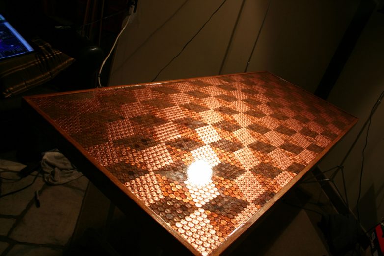 В общей сложности, на реализацию проекта у автора ушло порядка сорока часов. Callofthegame предварительно сортировал пенни по степени яркости, от латунно-блестящего до практически шоколадно-коричневого. В основе столешницы использовано дерево березы. Автор ее предварительно покрыл специальным раствором. Общий вес готовой столешницы составил более 45 килограмм. Все монетки, кроме одной, расположены вверх одинаковой стороной.