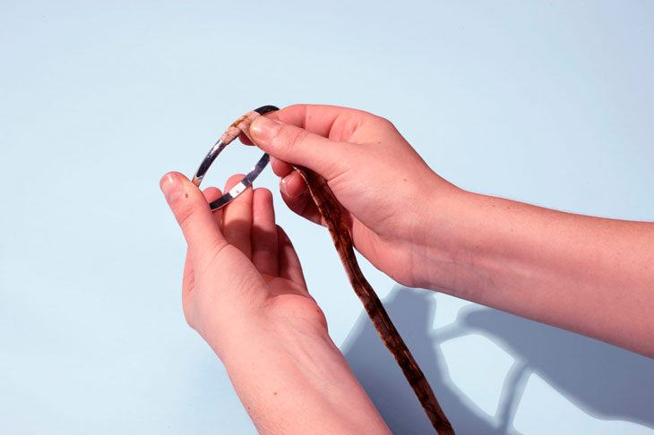 Поместите смазанный клеем конец полоски внутрь браслета лицевой стороны наружу. Плотно оберните полоску вокруг браслета так, чтобы ткань полностью прикрывала проклеенную часть. Для лучшей фиксации прижмите ткань пальцами на несколько секунд.