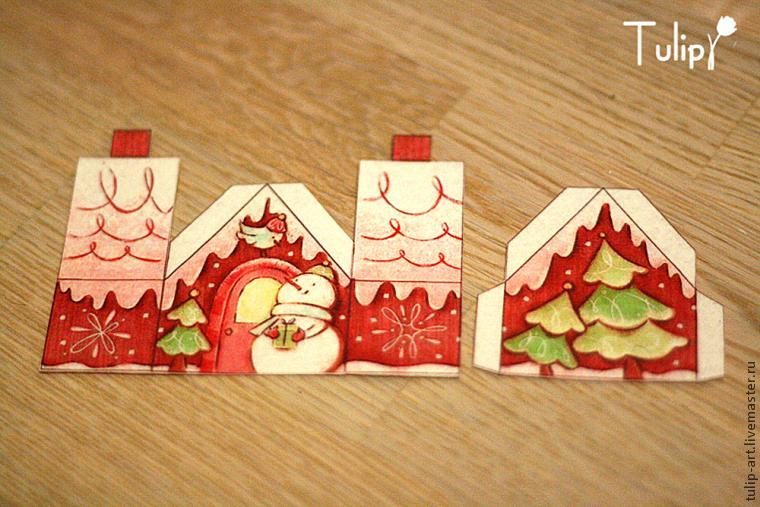 Свечи на елке в городской квартире — идея спорная по многим причинам, а вот сладости… В общем, очень мне захотелось использовать их в этом году :) И как раз мне попалась на глаза прелестная развертка для картонного домика, я сразу поняла, что это то, что мне нужно. Вот на основе этой развертки и будем делать наш домик-сюрприз.