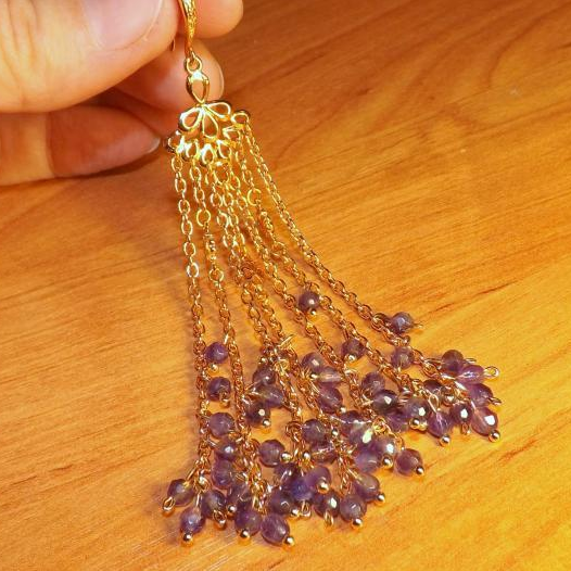 Теперь начинаем цеплять аметисты к цепочкам. Вначале крепим на каждую цепочку по четыре камушка, начиная снизу, на каждое звено по одной штучке. Вот так.