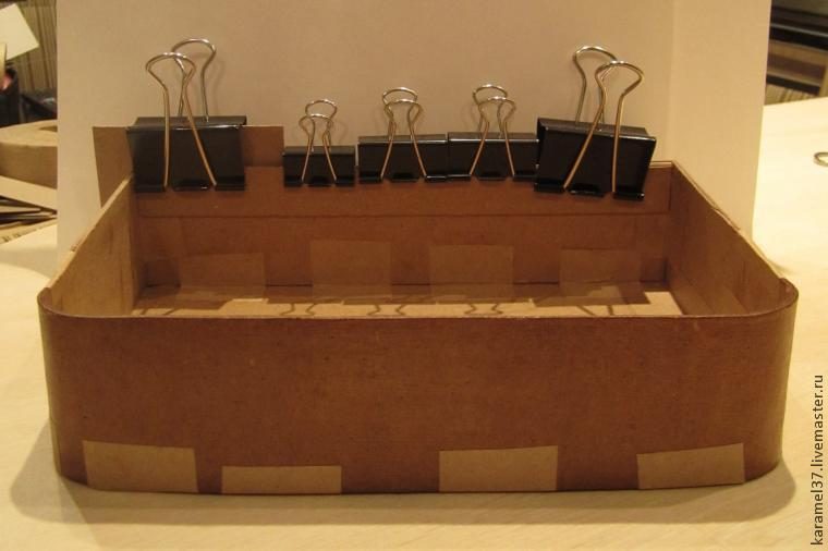 Следующим шагом будет сборка основания шкатулки. Подклеиваем боковые части и заднюю стенку. Они у меня состоят из нескольких слоёв картона. Опять покрываем ПВА. Заготовка становится гладкой и прочной.