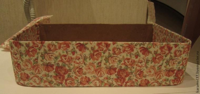 Теперь переходим к самому сложному и интересному. Начинаем оклеивать шкатулку тканью. Путём проб и ошибок и своих открытий, поделюсь своими наработками. Картон у нас тёмный, а значит он будет просвечивать через ткань. Чтобы этого избежать, я оклеила мою конструкцию тонким белым картоном и уже на него приклеивала ткань. Наносим ПВА небольшим слоем на белый картон, прикладывам ткань, разглаживаем и проглаживаем аккуратно утюгом через тонкую ткань, чтобы не было подпалин. Утюг ставим в режим 2. Есть ещё один вариант: мы не клеим белый картон, а грунтуем поверхность смесью белой акриловой краски и клея ПВА, покрываем и даём высохнуть. Затем уже приклеиваем ткань. Первый способ мне понравился больше.