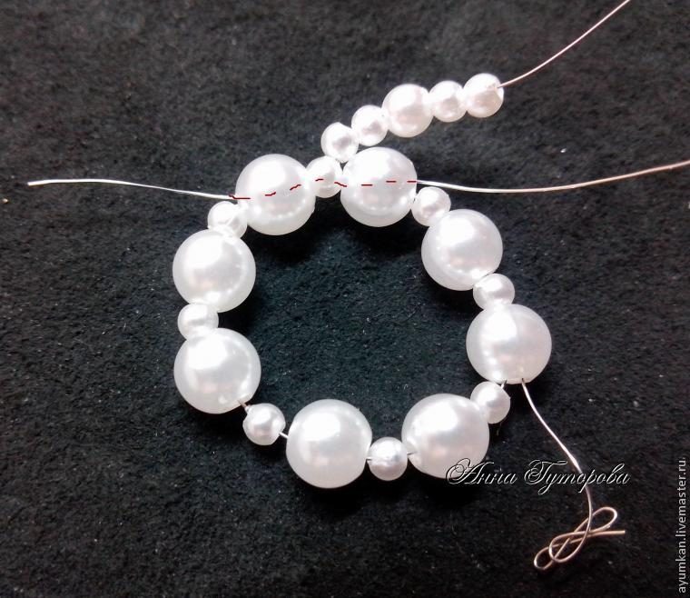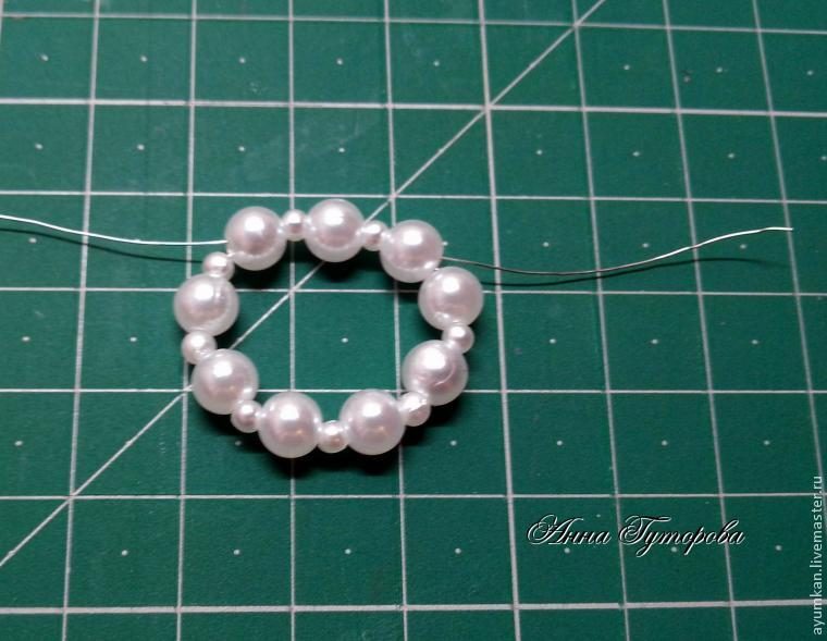 Набираем бусины в следующем порядке: одна бусина 6 мм, одна бусина 3 мм и так пока у нас не окажется на проволоке 16 бусин (8 бусин 6 мм и 8 бусин 3 мм).