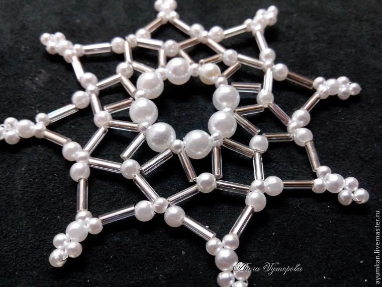 По такой схеме можно плести абсолютно разные снежинки, стоит только включить фантазию! Заменяете бусины на стеклярус, меняйте цвета бусин, и вот перед вами совершенно новая снежинка!