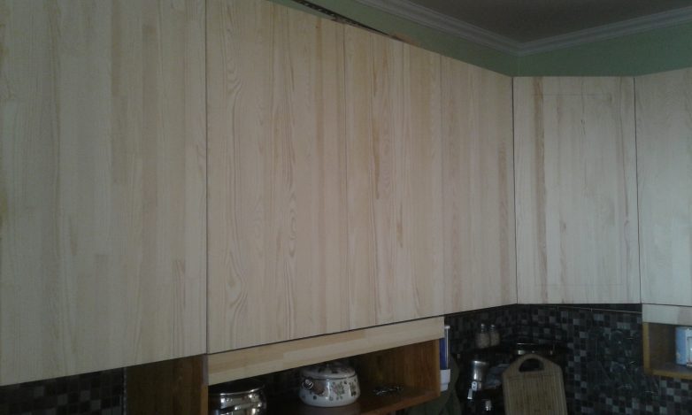 Щиты конечно хорошая штука для каркаса, но не для фасадов, большая температура в помещении «выдавит» смолу, не спасет даже корабельный лак.Плюс, кухонная влага может деформировать фасады, тем более, после того как автор отфрезеровал их.
