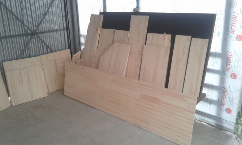 3. Подборка требуемого материала каркаса шкафов кухни. Вариантов в общем то не так уж и много: клеенные мебельные щиты из настоящего дерева (сосны например) или прессованная мебельная ламинированная или оклеенная пленкой ДСП. Мой выбор пал на мебельный щит из сосны. Пахнет просто замечательно. Пока я их обрабатывал просто наслаждался запахом сосны. Правда смолы много в ней. Можете выбирать по душе, что приятнее на ощуп или по фактуре. Мне захотелось чтоб именно фактура настоящего дерева и само его наличие были на моей кухне. Опять же я подумал, что настоящая древесина предпочтительнее, чем спрессованная с клеем и полимерами. Наверняка есть мебельные щиты из массива дерева — но это мне не по карману, потому это вариант даже не рассматривался.