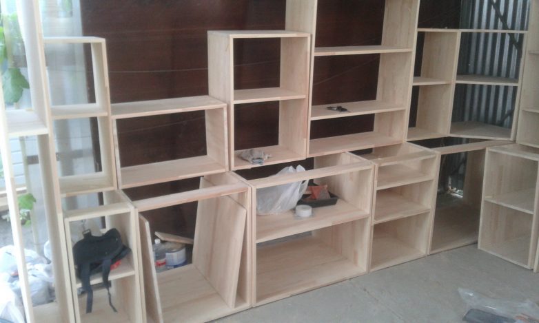 Все шкафы кухни собраны и готовы к окончательной шлифовке и покрытию морилкой и лаком.