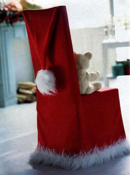Почему-то, давая советы по сервировке, специалисты обходят своим вниманием предметы мебели, без которых не обойтись при посиделках… в буквальном смысле. А между тем стулья с лёгкостью преображаются в новогодний арт-объект. Нужны лишь умелые руки и творческий подход. Например, при минимальных швейно-закройщицких навыках можно изготовить для спинок мини-костюм а-ля Санта-Клаус: красный кафтан, чёрный поясок, меховая оторочка — просто, забавно, эффектно.