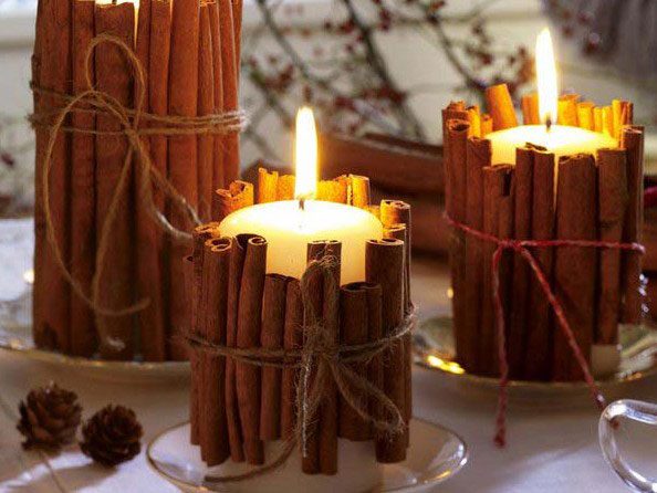 Впрочем, не бокалами едиными… оригинальность свечам придают разные вещи. К примеру, палочки корицы. Казалось бы, что уж проще — свеча большого диаметра, «заборчик» из специй, зафиксированный бечёвкой, обычное блюдце в качестве основы. Но результат впечатляет. Ощущение такое, что поработал маститый дизайнер. Несколько таких арт-свечей, расставленных на столе, создают неповторимую атмосферу, и всё остальное смотрится лишь как их дополнение.