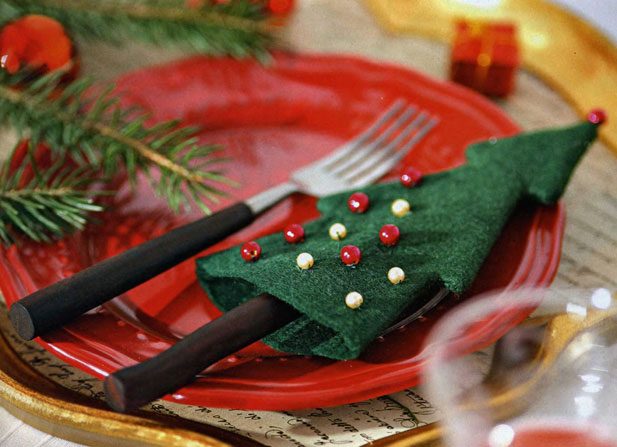 Вот, скажем, как вы подаёте на стол вилки, ложки и ножи? Дайте угадаем: если не придерживаетесь строгих правил — «нагишом», то есть без специального чехла для приборов, в остальных случаях — в бумажной или тканевой салфетке. А слабо подать в… ёлке?! Тёмно-зелёный фетровый холдер (держатель) с бусинами, имитирующими гирлянду, делается в два счёта, а удивляет в один момент. И даже не нужно быть мастером рукоделия: вырезаете две детали в форме ели, сшиваете их вместе, выворачиваете изделие и декорируете подручным материалом — всё просто.