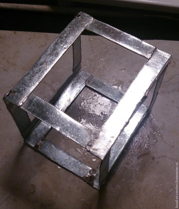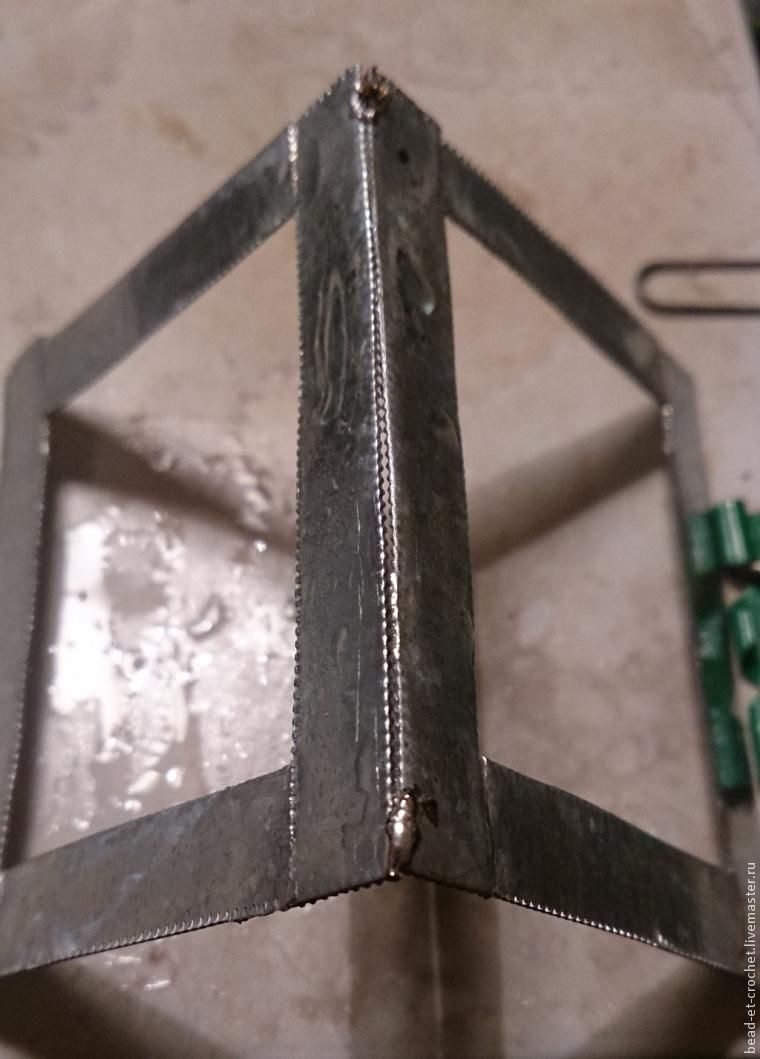 Это получилась четверть ножки фонарика. Соответственно, мастерим по образу и подобию еще три таких же конечности. Потом собираем из них вот такую конструкцию, запаивая уголки (я делала это снаружи, т.к. инструмент большой и изнутри сделать аккуратный шов не получалось):