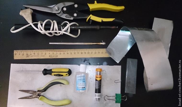 Итак, нам понадобится: паяльник (у меня старый советский без маркировок, так что мощность остается загадкой), припой оловянный, кислота паяльная, деревянная палочка для ее нанесения, ножницы по металлу (если имеются, а если нет, то когда-то я резала жестянку простыми старыми тупыми ножницами), линейка, наждак / напильник, шило (толстая игла, гвоздь — любой предмет, чем можно царапать), длинногубцы / пинцет, жесть (обрезки металлического профиля или простая консервная банка). Если что забыла — напишу в процессе.