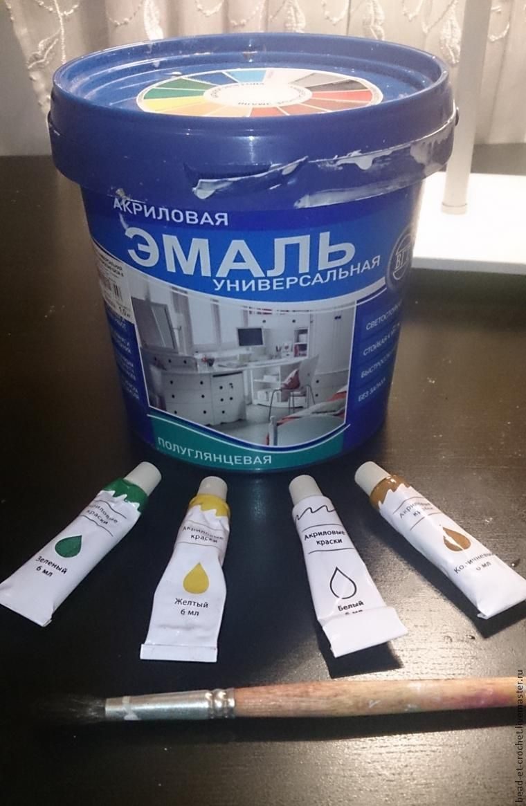 Эмаль — из строительного магазина, а маленькие тюбики — из «Фикс Прайса», так что претензий к ним никаких ввиду цены. Я красила в два слоя белым акрилом, что позволило скрыть металлическую суть предмета и дополнительно выровнять неровности, оставшееся кое-где после шлифовки. Далее два слоя зеленого цвета. Наносила их друг за другом, не дожидаясь полного высыхания, в результате местами появился эффект кракле, чему я рада вполне!